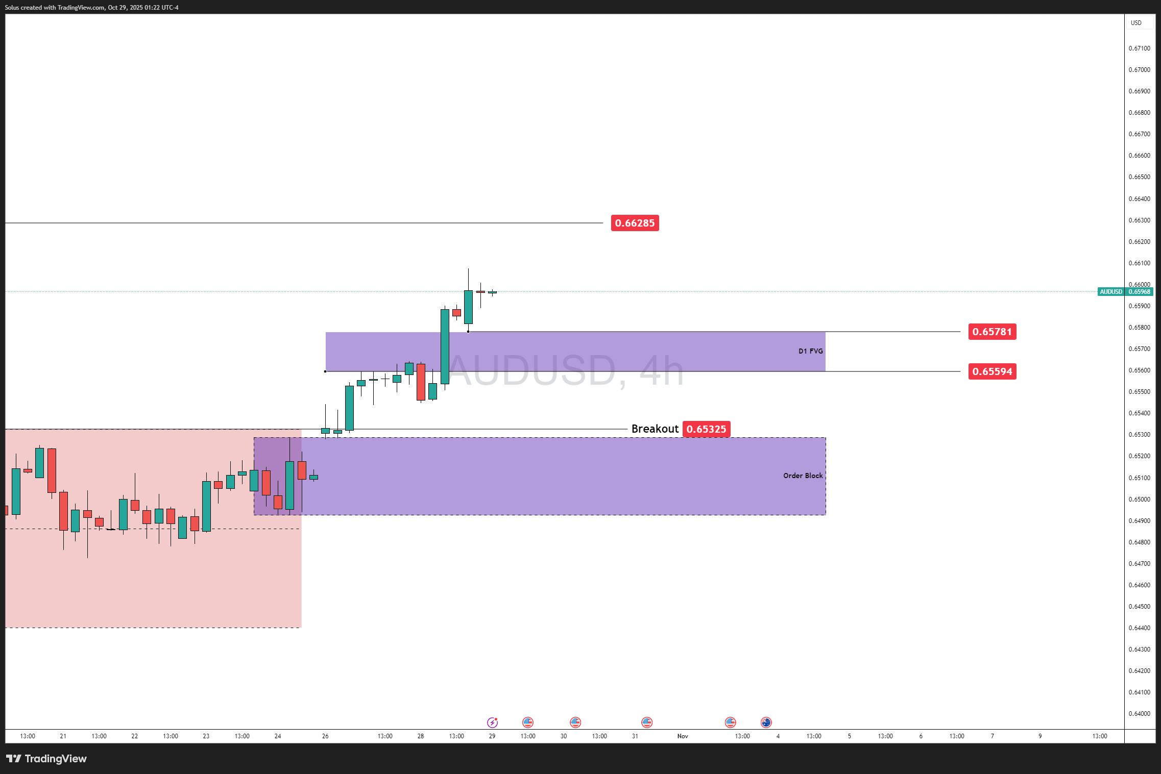 The breakout above 0.65325 signaled the transition from accumulation to expansion — a key behavioral trait of smart money. Weeks of consolidation had built liquidity on both sides, and once swept, price displaced strongly to the upside.