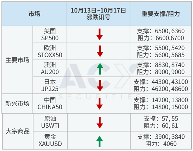 上周四中国进一步收紧稀土管制,周五川普扬言回敬 100% 关税,为月底川习会增添变数,风险性资产集体下跌,标普500指数单日跌幅创下 4 月解放日以来新高,跌幅集中在科技板块,指数一口气回到季线重要支撑。欧股同样受拖累,日股则回吐高市早苗将出任首相迎来的庆祝行情,中国A50指数也一举跌破季线,虽然本周一,川普释放乐意谈判的信号,不过在指数尚未站回月线前,对美欧日中股指操作上保持逢高偏空。
