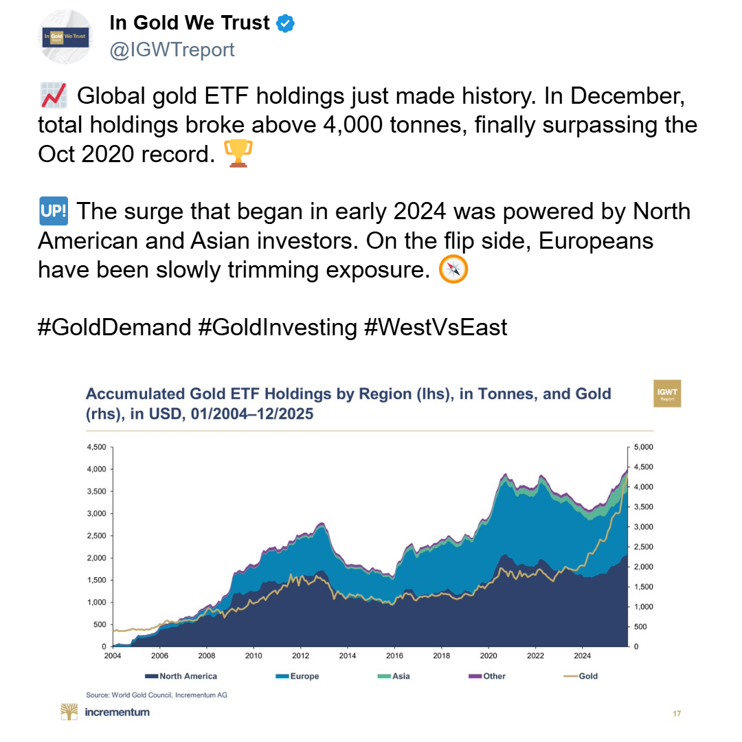 Retail sentiment, as seen on X (formerly Twitter) and Reddit, remains overwhelmingly bullish, with many "buying the dip" at $5,000. However, with global gold ETF holdings hitting record highs above 4,000 tonnes, the market is "over-owned." When everyone is already "all in," who is left to buy? This sentiment extreme is precisely why we expect a deeper correction toward the $4,800–$4,900 zone.