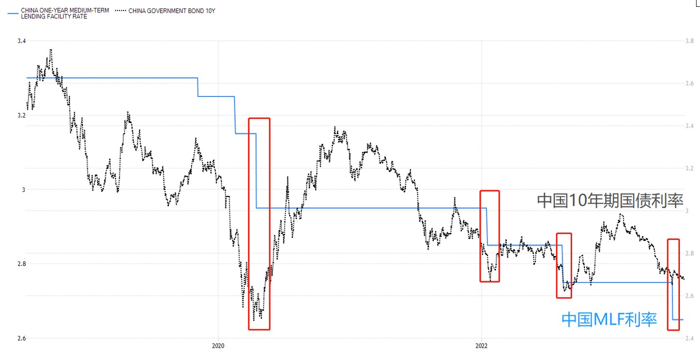 中期借贷便利MLF利率是央行发布的一年期利率,是央行对市场利率的引导;而国债利率则是市场交易出来的利率,反映的是市场对未来利率的预期。今年春节过后2月份开始,受到不及预期的经济复苏表现影响,中国国债利率与股市一同见顶回落。受到降息预期的影响,一年期国债利率一路跌至1.8%,但央行的MLF利率才下调0.1%至2.65%。这种利率的背离其实并不少见。由图可见,在过去三年里,央行的降息反而是国债利率反弹的信号。因此本次的降息操作反而可能是中国国债利率见底的信号。0%的通胀令市场充斥着过度的降息预期,考虑到GDP数据好坏参半,或挤出过量预期。中短线来看,中国国债利率有较大的反弹空间。不过后续利率的变化还是要跟踪经济数据的走向。