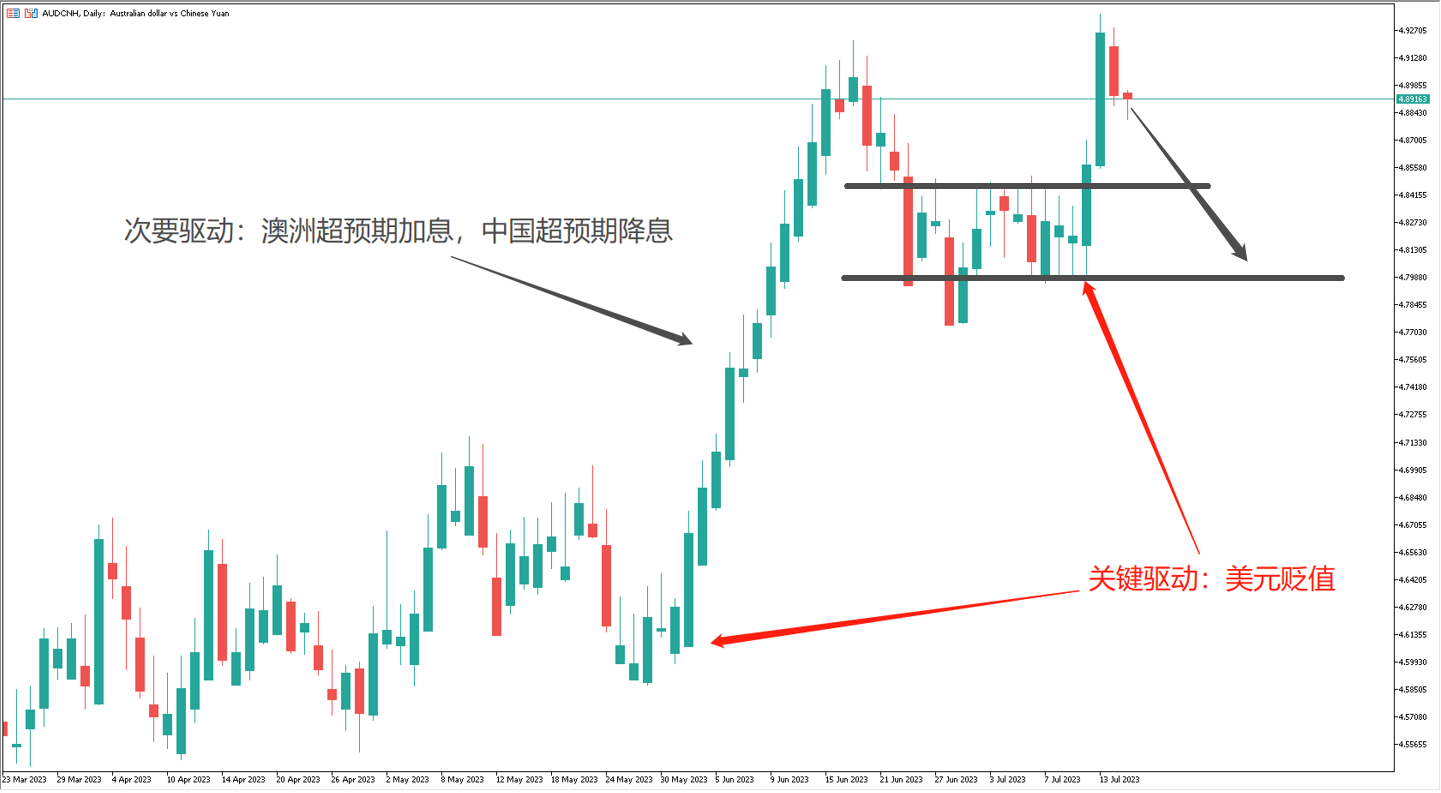 受到国债利率直接驱动的便是人民币的汇率,因此人民币中短线有较大的升值空间。相比之下,澳元受美元影响,有超涨影响。从澳元兑人民币日线图来看,两次汇率的大涨均受到美元贬值的影响。虽然长线基本面不利于美元,但美元当前的超跌现象也给予美元反弹的空间。整体来看,交易策略应该以逢高做空为主,现价上方的阻力在4.9-4.93的前高点关口。现价下方的技术面支撑分别在4.85和4.8的震荡区域上下沿。如果汇率跌破4.8大关,则基本面支撑可以关注4.7关口。
