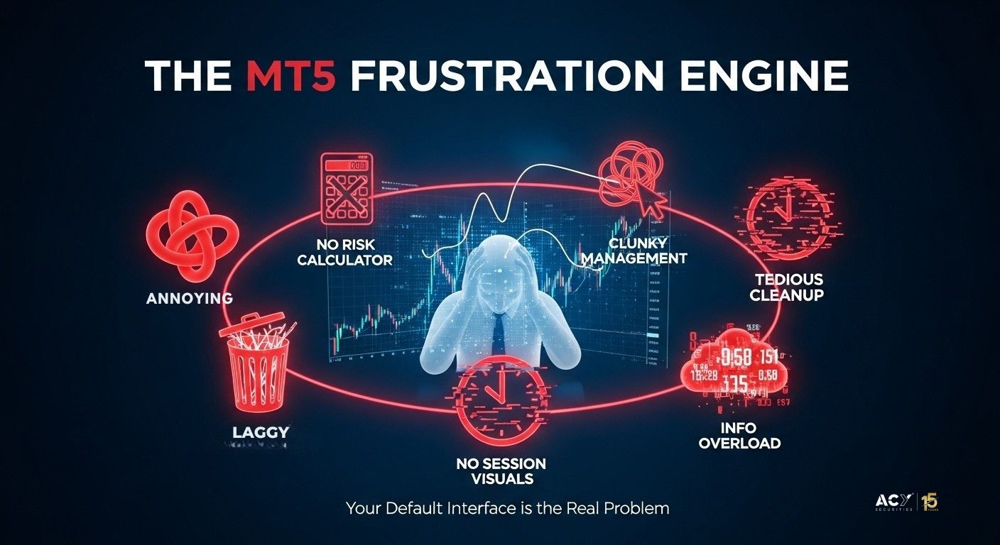 MetaTrader 5 is a powerful trading engine, but let's be honest,its interface can feel like a relic from a bygone era. If you've ever struggled with its clunky risk calculation, wished for a simpler way to manage trades, or found yourself squinting at a chart cluttered with manually drawn objects, you are not alone. A quick glance at trading forums reveals a shared frustration among beginner and intermediate traders: MT5 is robust, but it lacks the intuitive, quality-of-life features of modern platforms. This friction in your trading workflow isn't just an annoyance; it's a source of unforced errors, wasted time, and unnecessary stress.