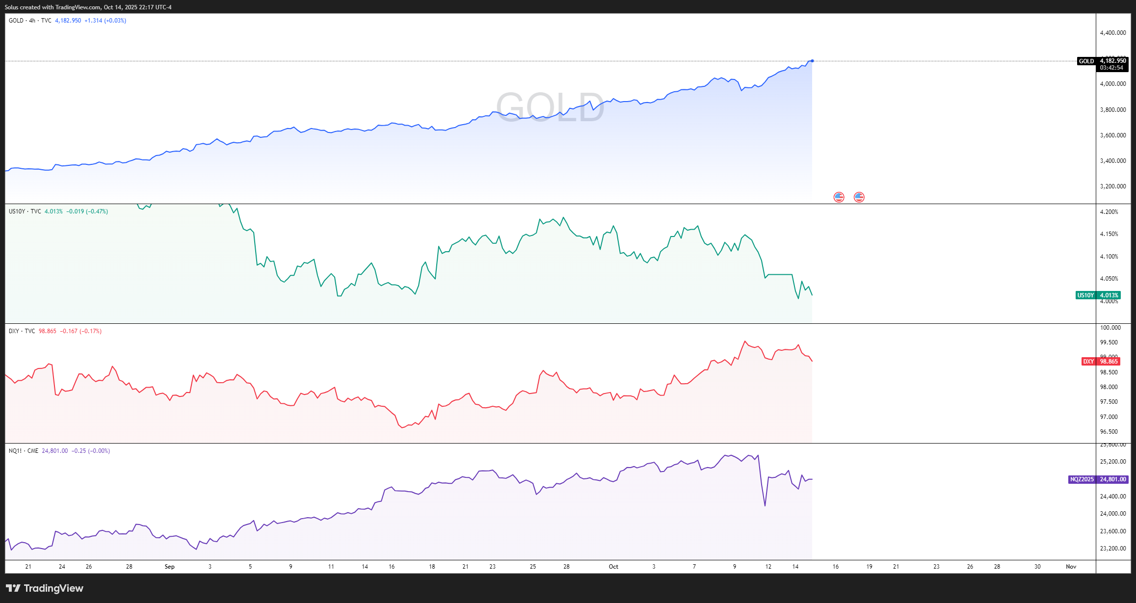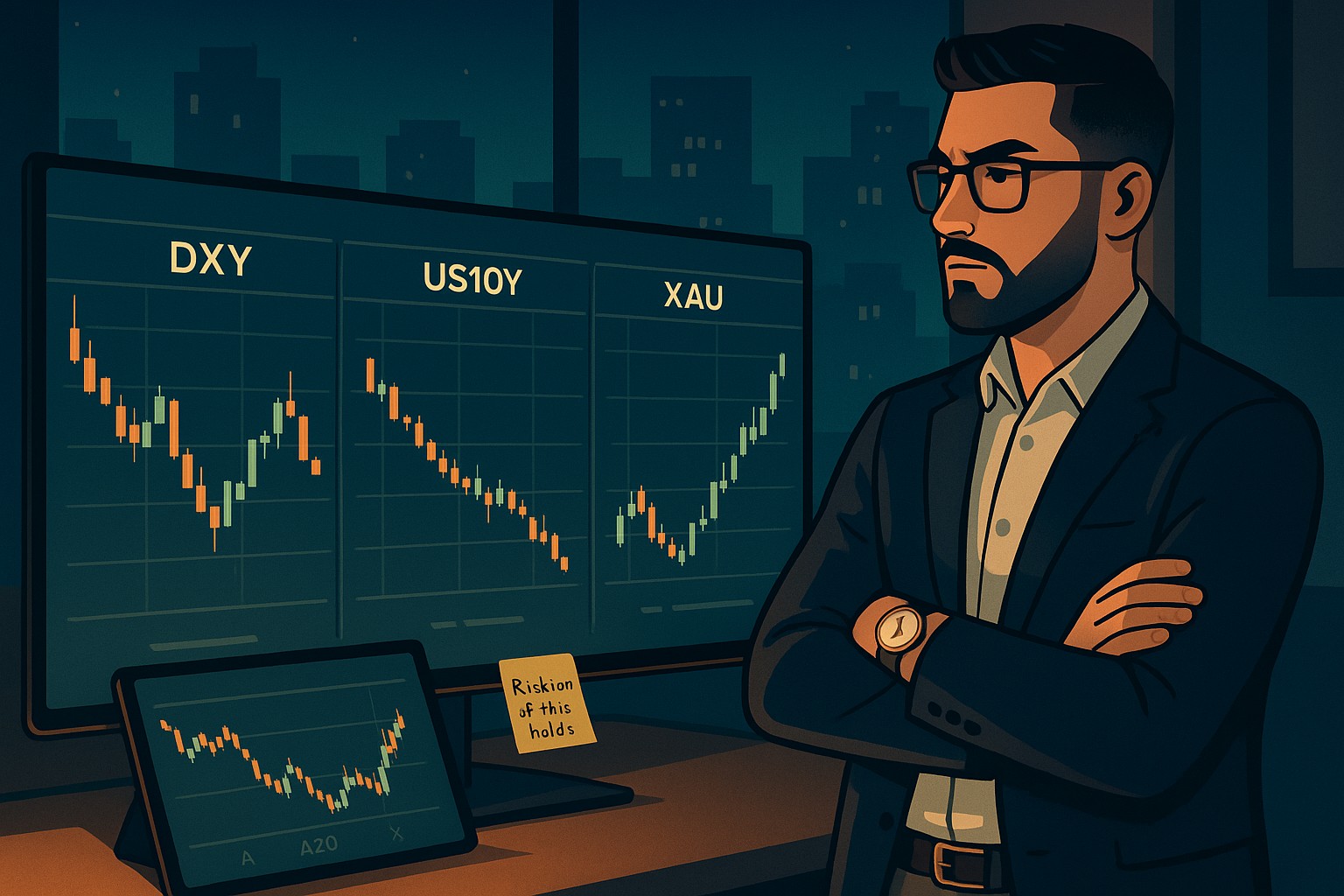 Begin with DXY, 10-year yields, gold, and a major index like Nasdaq or the S&P 500. If three of those agree, you likely have the dominant theme.
