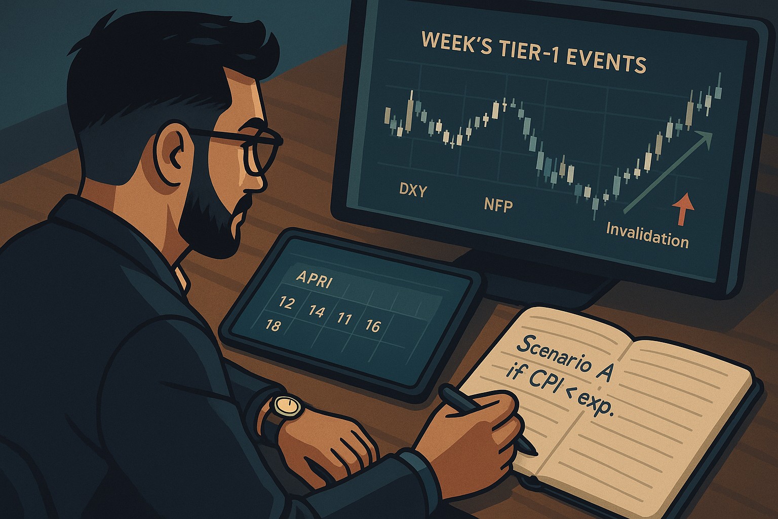 • Sunday: mark Tier-1 events and sketch the likely narrative path if the numbers land as expected vs surprise.