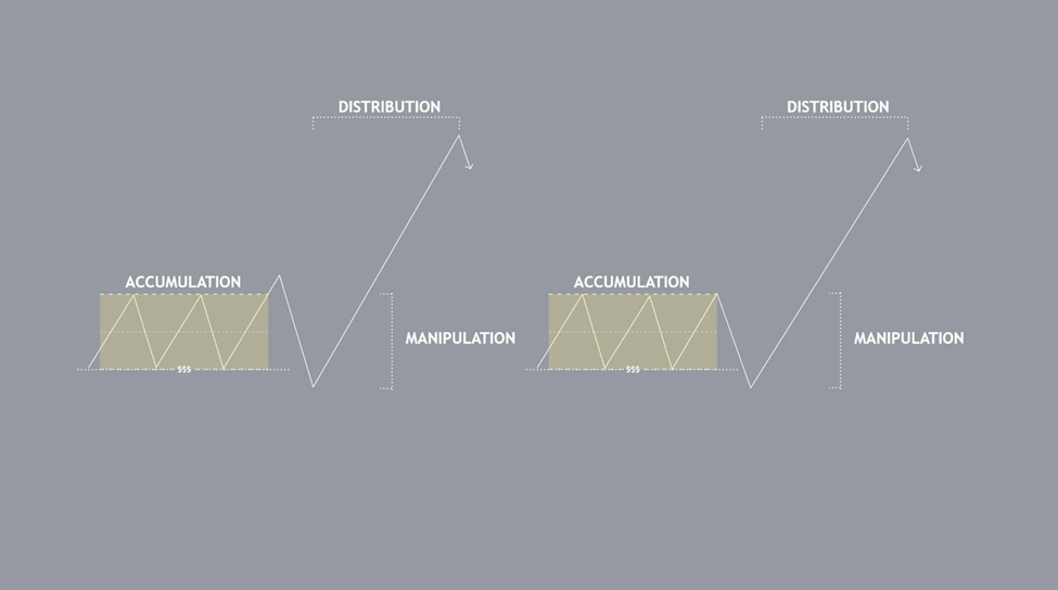 • Distribution: Happens from London to the US session. Price moves with momentum after stops are taken, targeting key levels such as previous highs or lows.