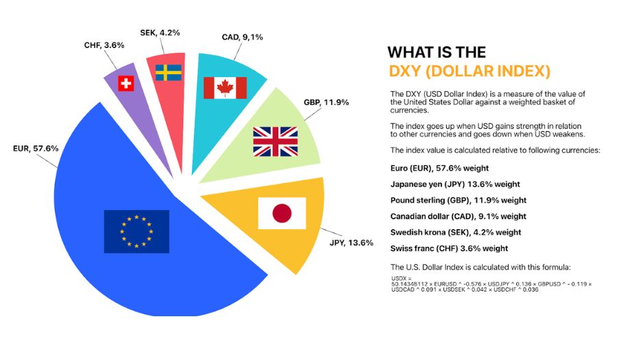 The US Dollar Index (DXY) is a pivotal measure that gauges the strength of the US Dollar relative to a basket of major foreign currencies. This basket comprises the Canadian Dollar, Euro, British Pound Sterling, Swedish Krona, Swiss Franc, and Japanese Yen. First introduced by the Federal Reserve in 1973, each currency in the DXY is assigned a specific weight. Among them, the Euro stands out with the highest weightage, reflecting its significant role in global trade.