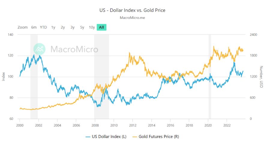 The relationship between the DXY and gold prices is predominantly inverse. As the DXY climbs, gold prices often retreat, prompting traders to pivot towards the USD as a preferred financial allocation. Conversely, during periods of economic uncertainty or when the DXY wanes, gold, as a traditional safe-haven asset, witnesses an uptick in demand. Traders gravitate towards gold as a hedge against currency devaluation, safeguarding their assets.