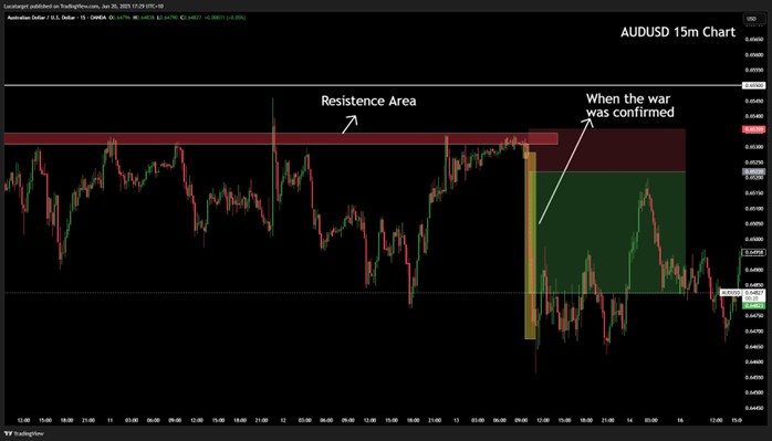 When news like “war confirmed” hits, your first move is to check your charts. In this case, AUD/USD was already testing a key resistance level.