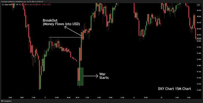 And here’s the beauty of it: you don’t need to guess. If there’s war news, you simply check the DXY chart. If it’s breaking out above a recent high, you know capital is moving into the dollar with force.