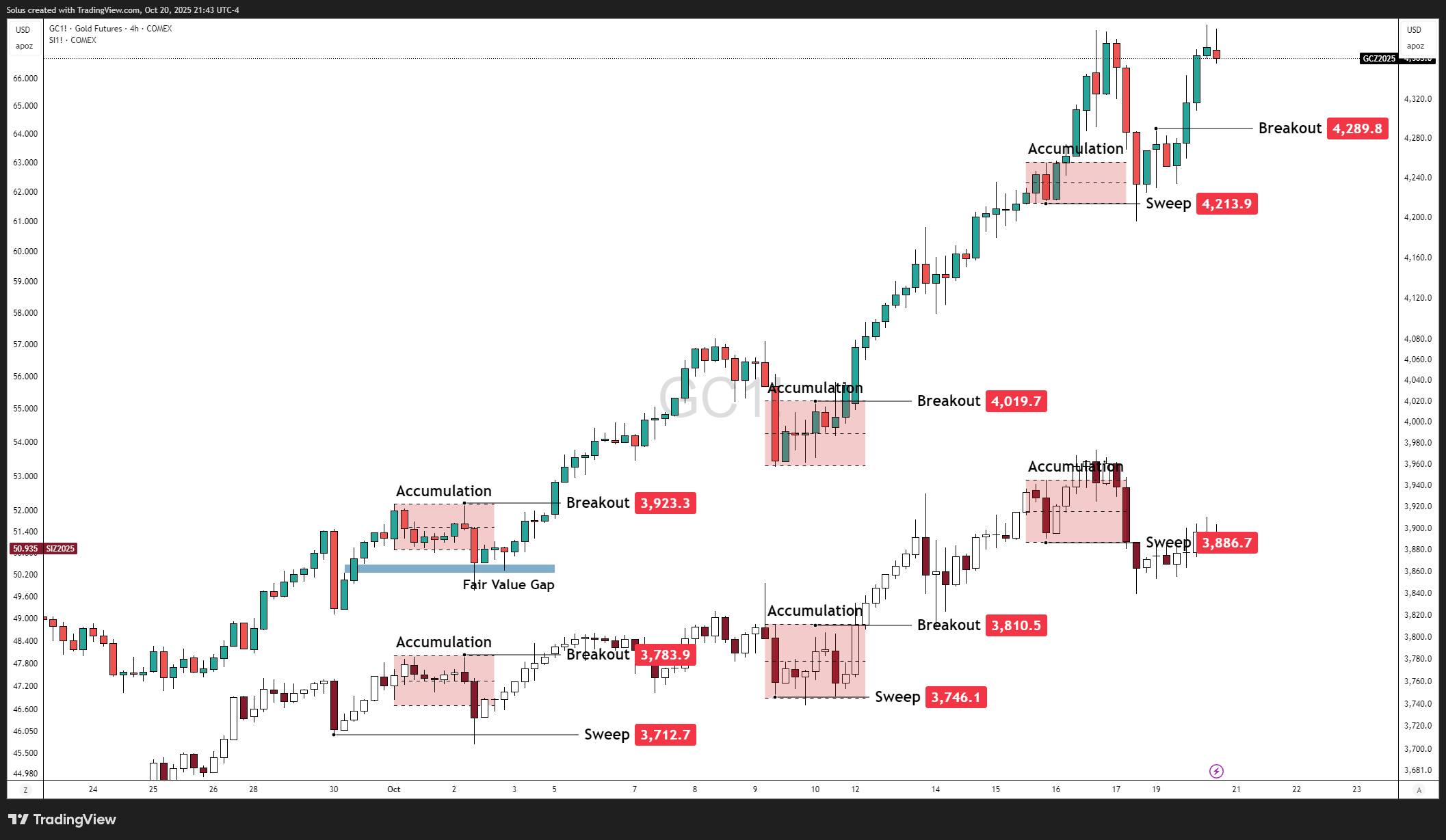 In Smart Money terms, this is where professional traders look for liquidity sweeps in both metals — watching if gold’s short-term strength is merely reactive before silver resumes its broader uptrend.