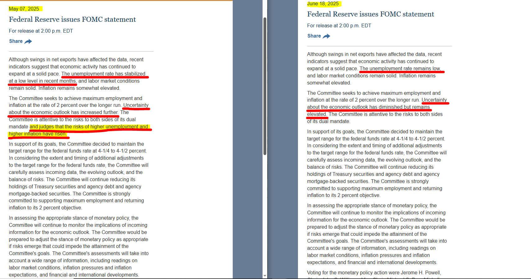 Let me show you an example from the FED/FOMC. We can clearly see that within a short span of one month, many words in the statement have changed, but the majority remain the same.