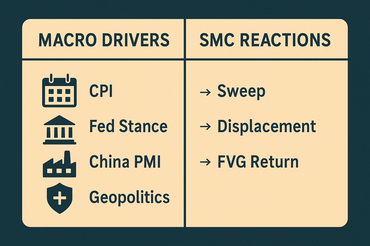 | China manufacturing uptick | Bullish copper, silver | Use pullbacks into FVGs as re-entries after data-driven breakouts. |