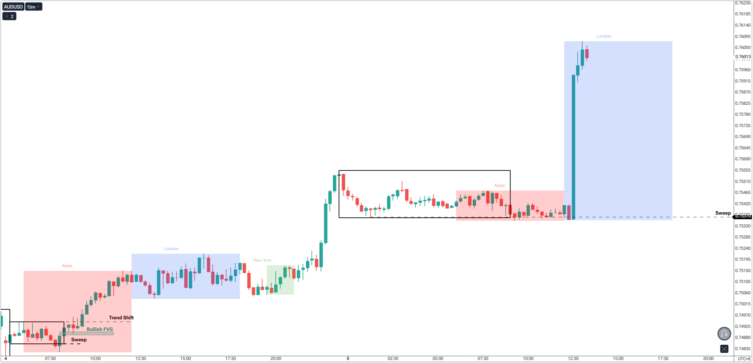 Example: NY trended cleanly, Asia drifts sideways, waiting for London’s liquidity injection.