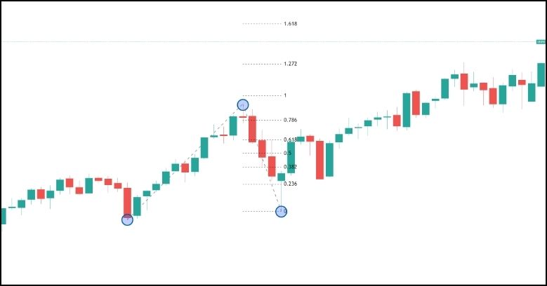 The tool then projects levels like 1.0, 1.272, 1.618, 2.0, and beyond.