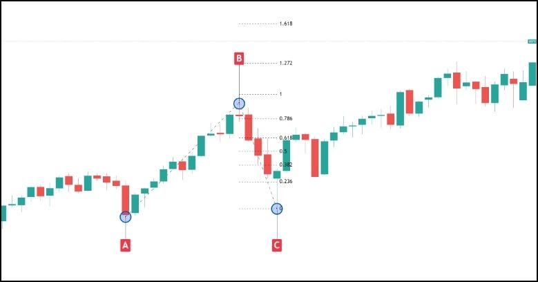 – You must wait for a proper pullback (Point C) before drawing the extension.