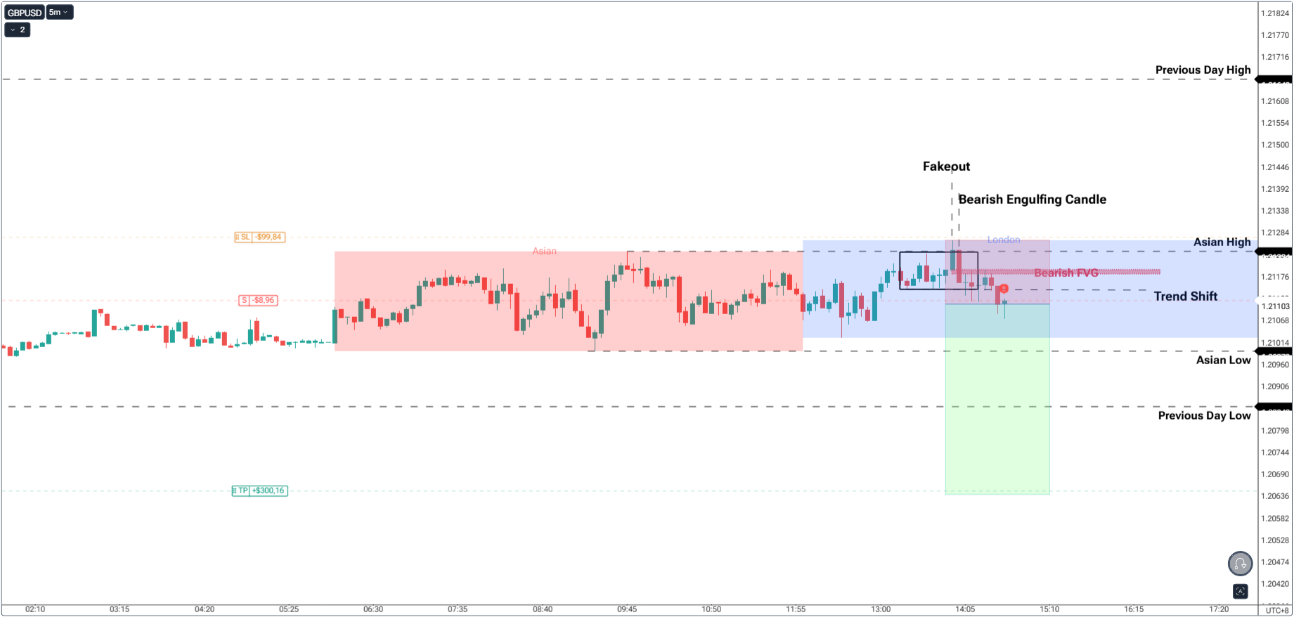 Plot the previous session high and low, then wait for one to be taken out before forming a market structure shift and fair value gap.