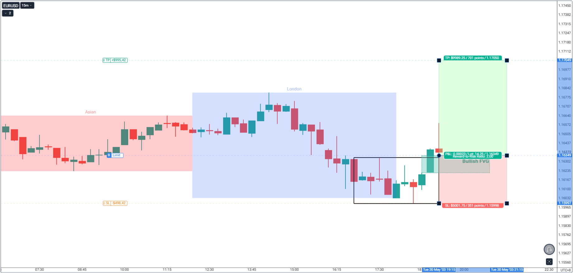 3. Wait for the Sweep: Do not enter until London runs one side of the range. Since our overall price action on a higher timeframe is bullish, we look for a sweep of low then a reversal to the upside.