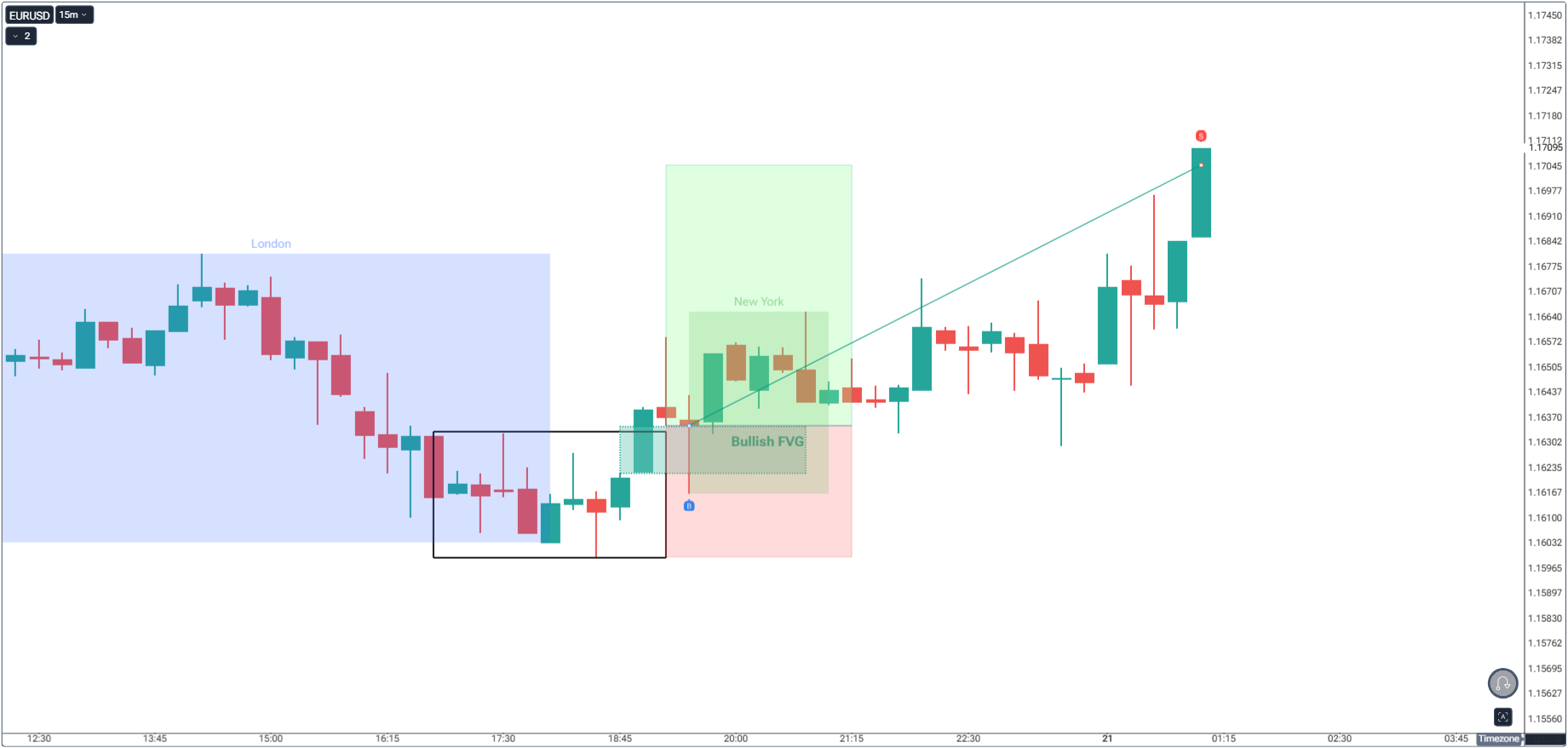 • With liquidity collected in London, New York pushes price toward the opposite end of the range.