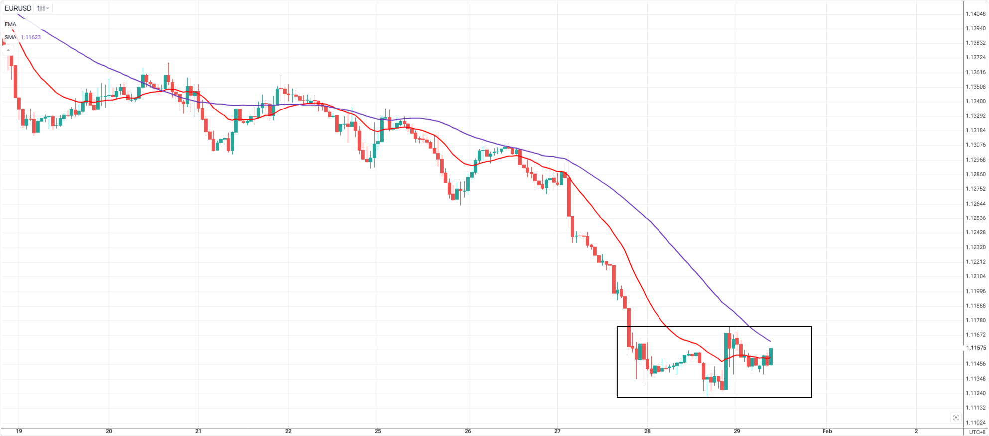 • 20 EMA and 50 SMA are flat or crossing repeatedly