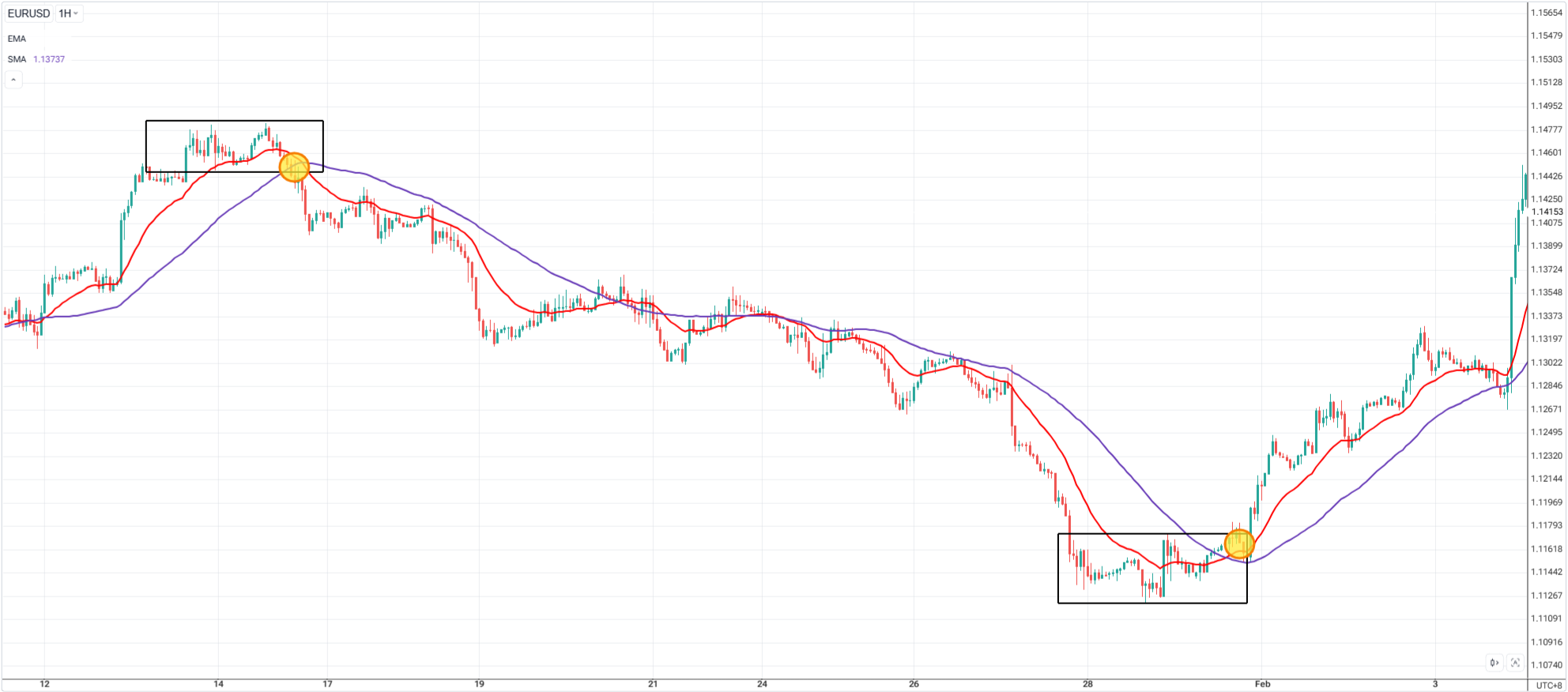 • Price above both = bullish trend (look for buys)