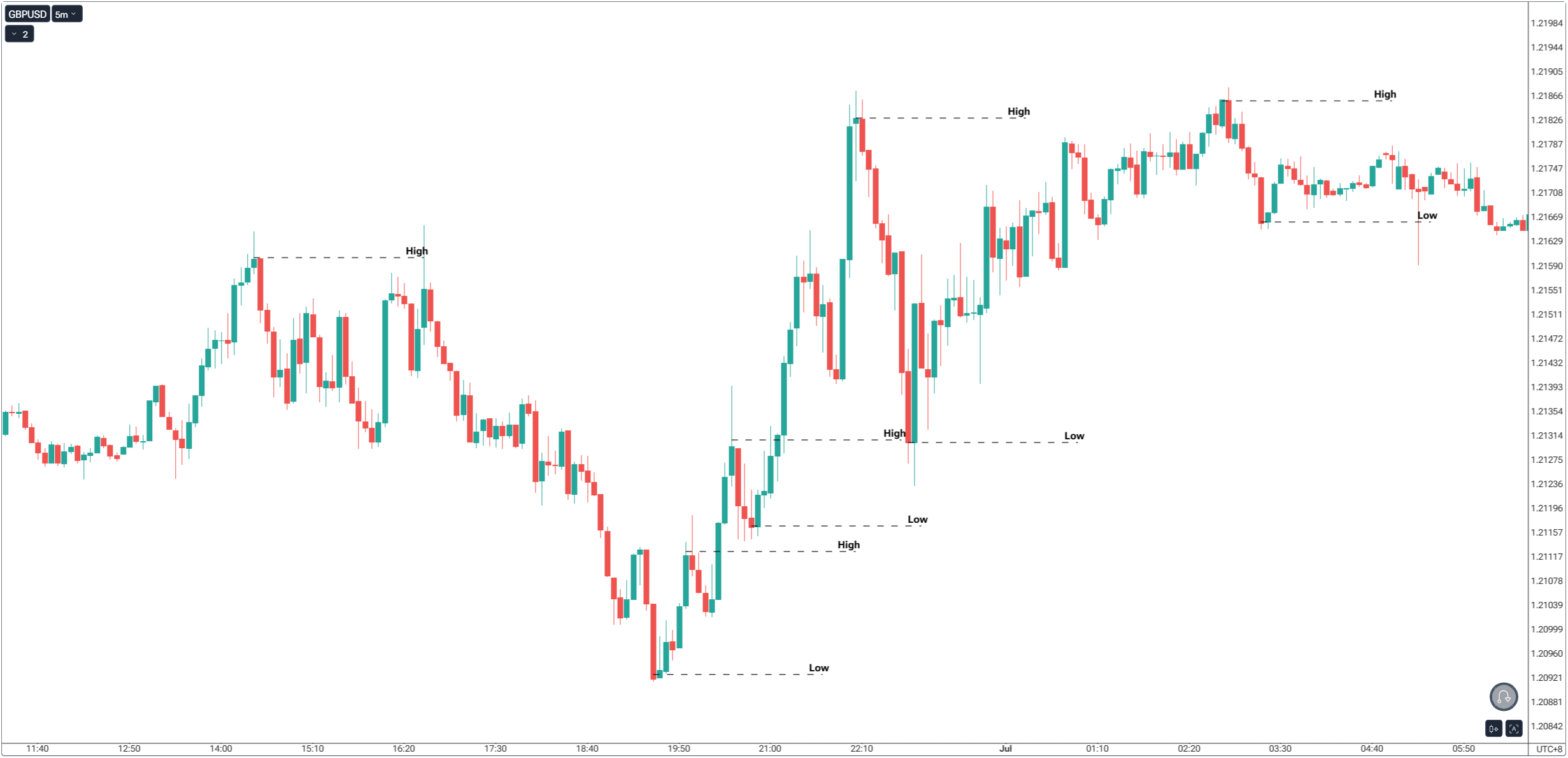 • Swing Low: forms when price drives downward, stalls, and then fails to push lower. Buyers overpower sellers, creating a trough. On a chart, it’s a candle with lower lows surrounded by two higher lows.