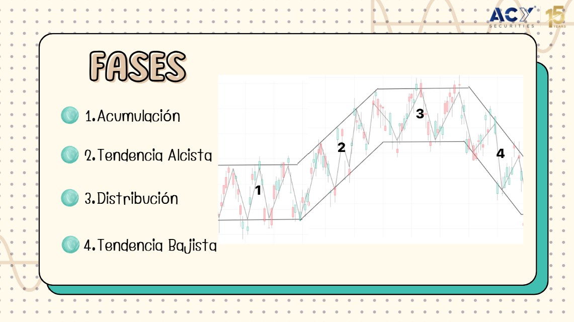 El precio suele moverse de forma lateral, con poca volatilidad, mientras el mercado absorbe liquidez y se construyen posiciones.