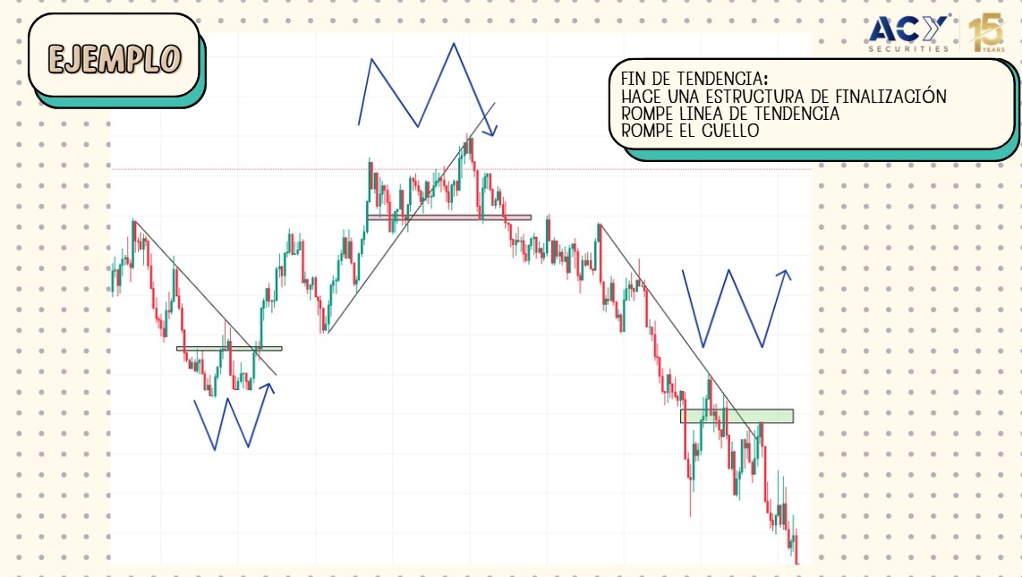 En la imagen vemos que los primeros 2 patrones cuentan con los 3 elementos y se cambió la tendencia. Pero el tercero, aunque aparentemente hizo un patrón, no rompió la línea ni tampoco el cuello y continuó bajista. Por eso es importante esperar los 3 elementos.