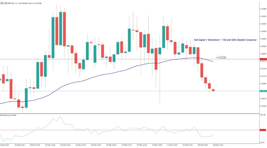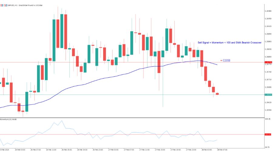 4. Sell Signal – Momentum < 100 and SMA Bearish Crossover: In the given chart, the sell signal is reinforced by the Momentum Indicator's value below 100 and the price's position under the 50-period EMA. A trader might consider this a favourable moment for selling, expecting the GBP/USD pair to depreciate further.