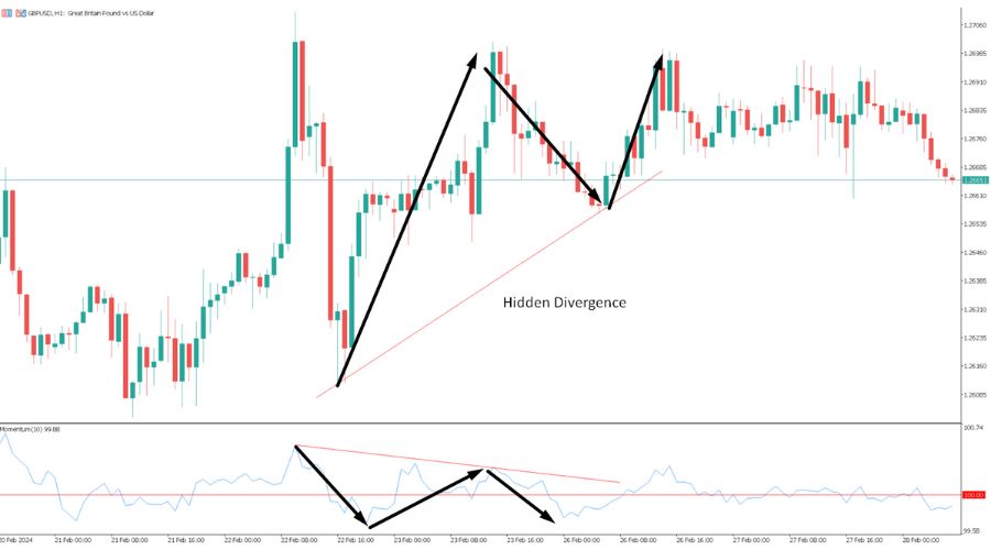 If price highs or lows are not confirmed by the momentum indicator, it may signal an upcoming reversal. For example, if GBP/USD hits a new high but the momentum indicator does not, traders might anticipate a potential decrease in price, advising caution and further analysis before making trading decisions.