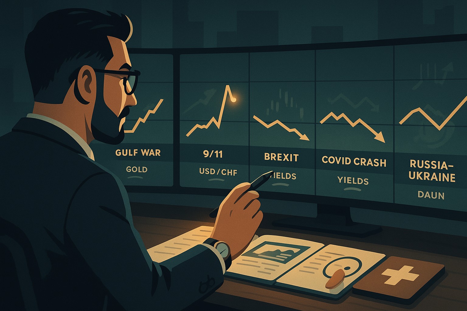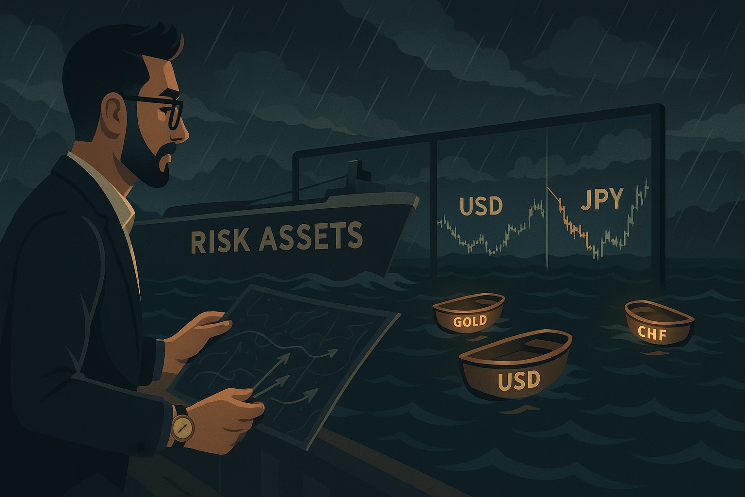 Picture the market as a fleet sailing across calm waters. Suddenly, a storm hits. Some ships take damage (equities, EM FX), while others act like lifeboats (gold, USD, JPY, CHF). The edge isn’t predicting the exact minute the storm begins; it’s knowing where the lifeboats are and how quickly you can board without capsizing your own craft.