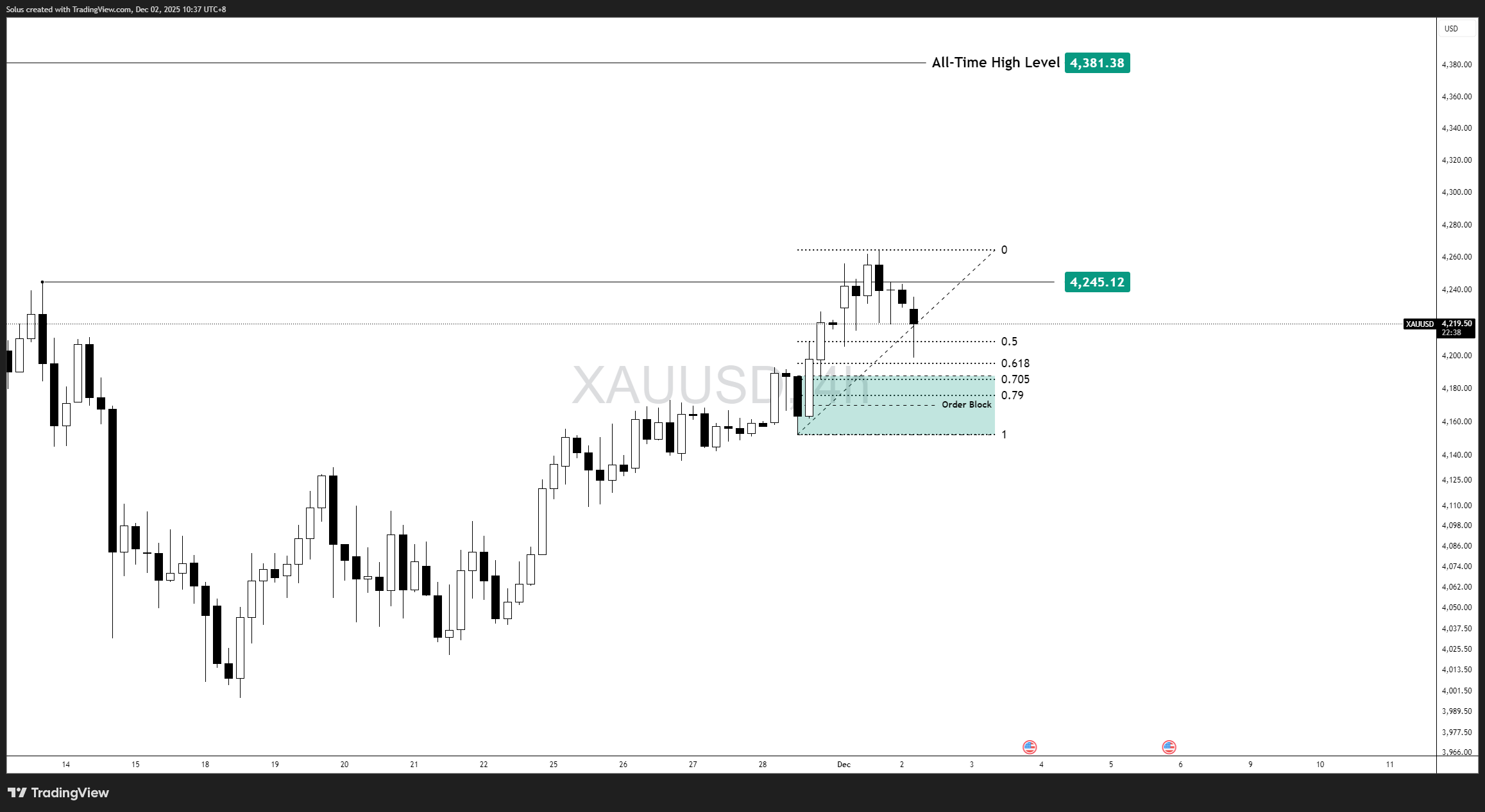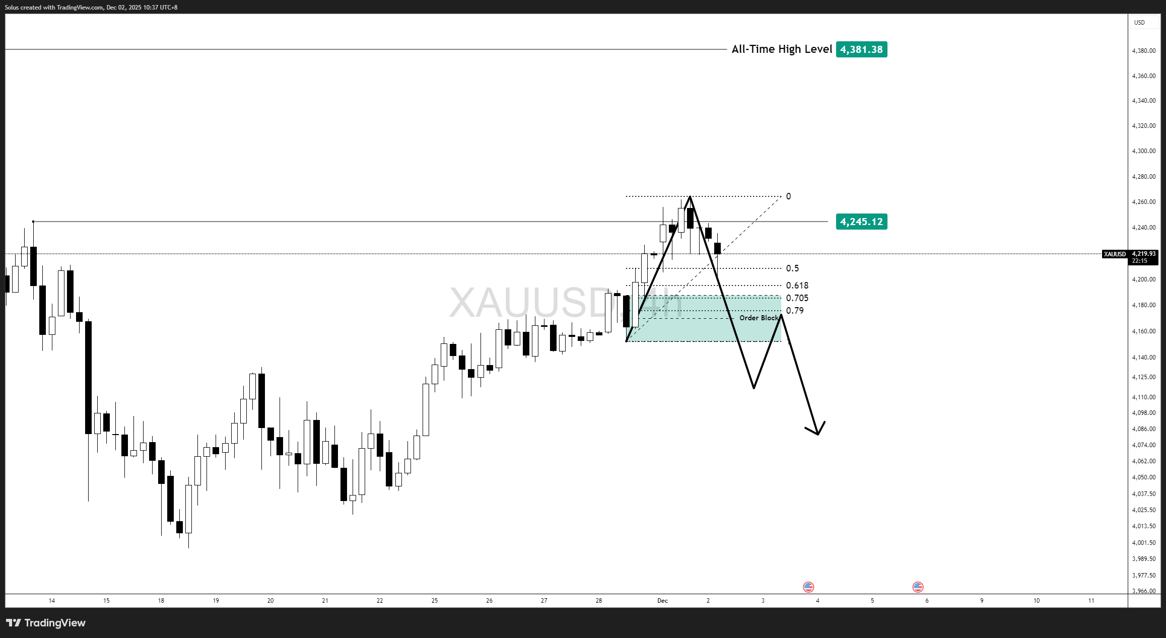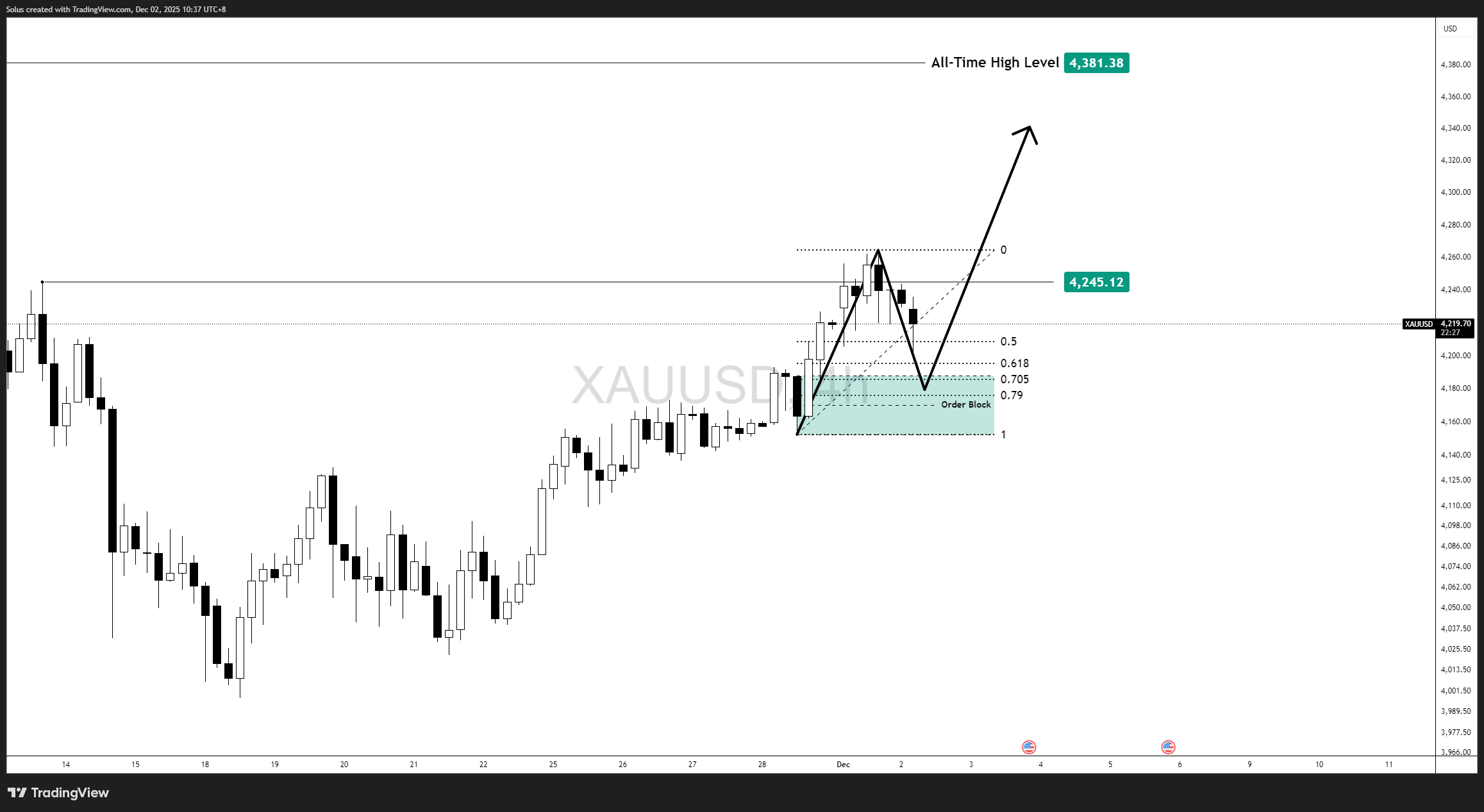 If gold holds above near-term support and maintains momentum, expect continuation into the all-time high region and potential liquidity sweep above it.