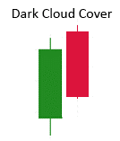 A Dark cloud cover is formed when the 1st candle has a long bullish body, and the 2nd candle opens at a new high – this confirms the uptrend but closes lower than the midpoint of the 1st candle.