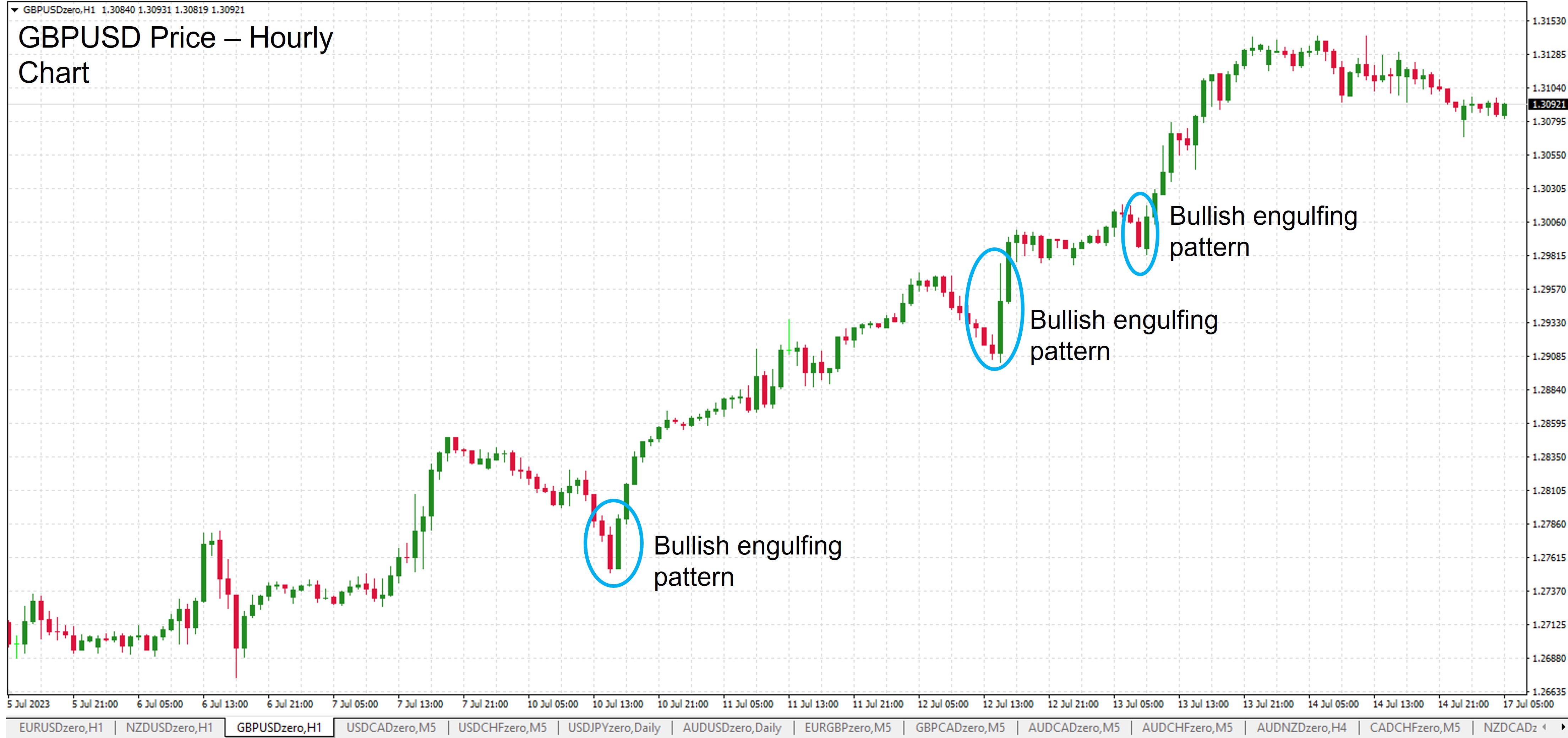 A bullish engulfing pattern is the same as the bearish engulfing pattern but in the opposite direction and is one of the best candlestick patterns for day trading.