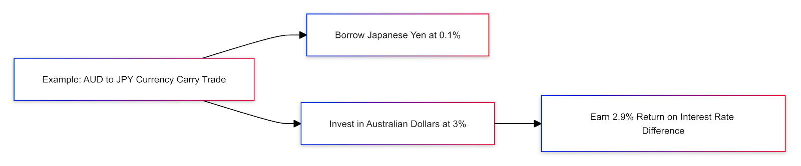 For instance: Consider the AUD/JPY pair. The Australian dollar (AUD) usually has a higher interest rate than the Japanese yen (JPY). A trader might borrow yen at 0.1% and trade in Australian dollars at 3%, potentially earning a 2.9% return, depending on market conditions.