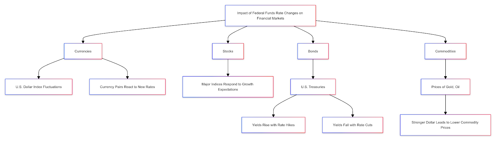 • Currencies: The U.S. Dollar Index, along with currency pairs like EUR/USD, often experiences sharp fluctuations as traders react to the new interest rate environment.
