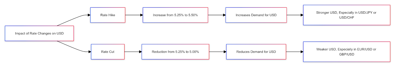 • Rate hike (e.g., 5.25% to 5.50%): Increases demand for the U.S. dollar, often leading to a stronger USD, especially in pairs like USD/JPY or USD/CHF