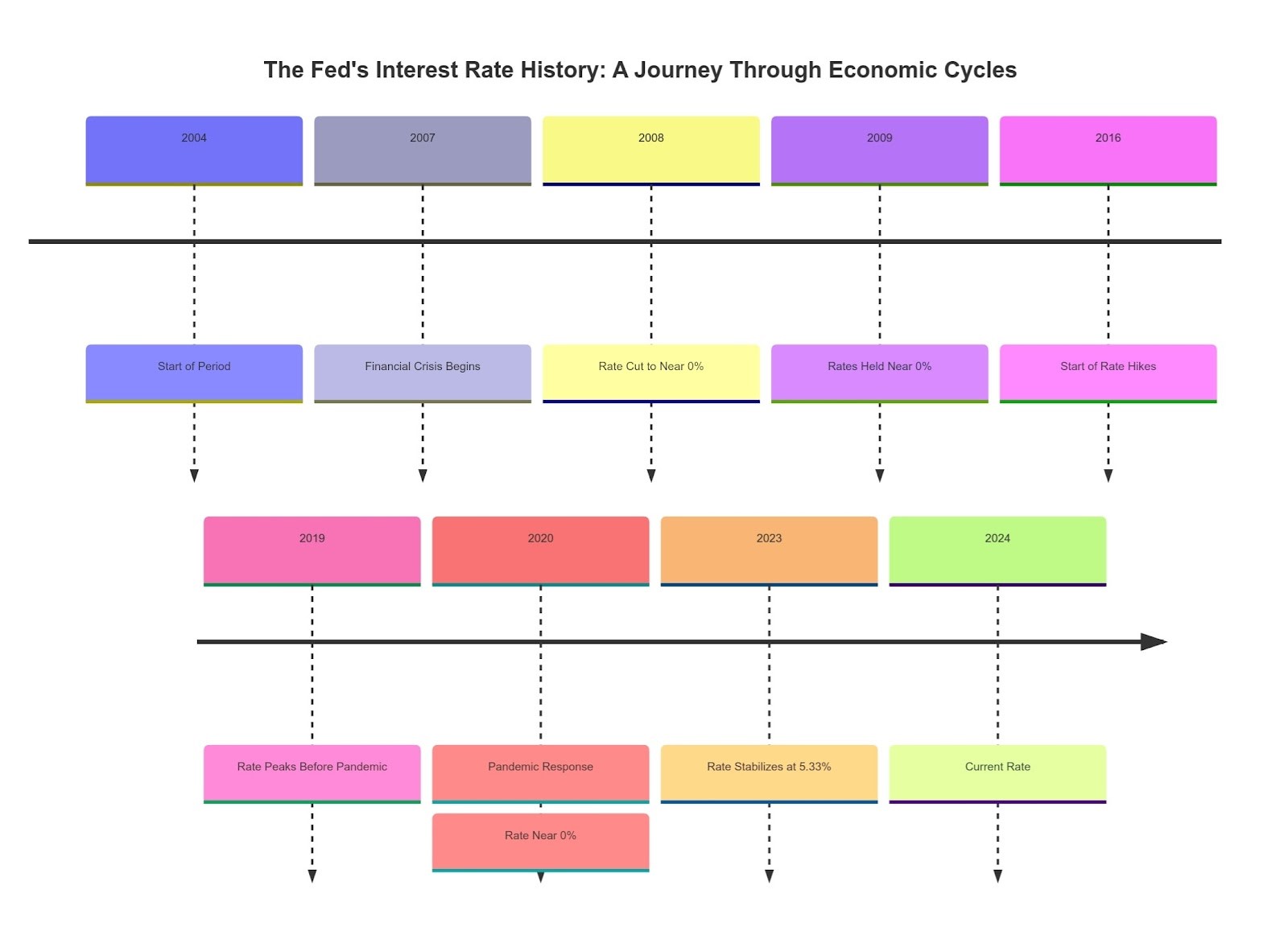 This historical journey through the Fed's interest rate decisions highlights the central bank's role in navigating the U.S. economy through both crises and recoveries, using rate adjustments as a key lever to influence economic outcomes.