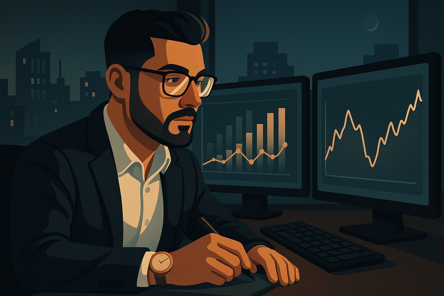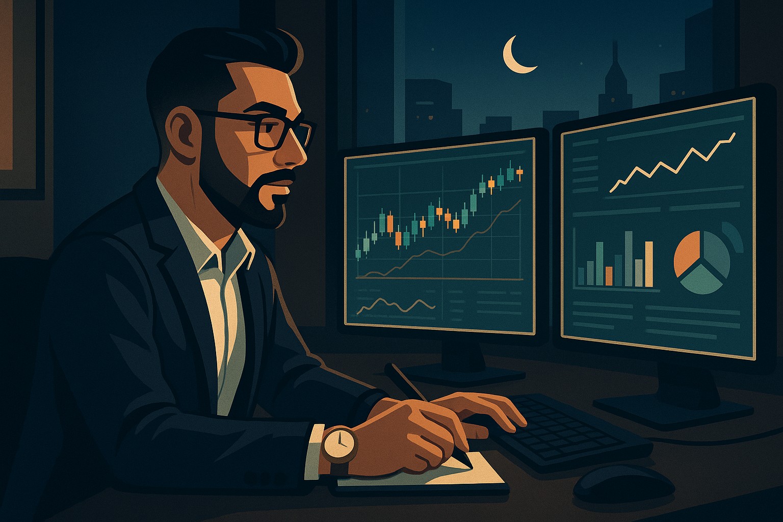 Scene Idea: The Trader executing a trade with calm precision as charts glow around him - no hesitation, no fear.