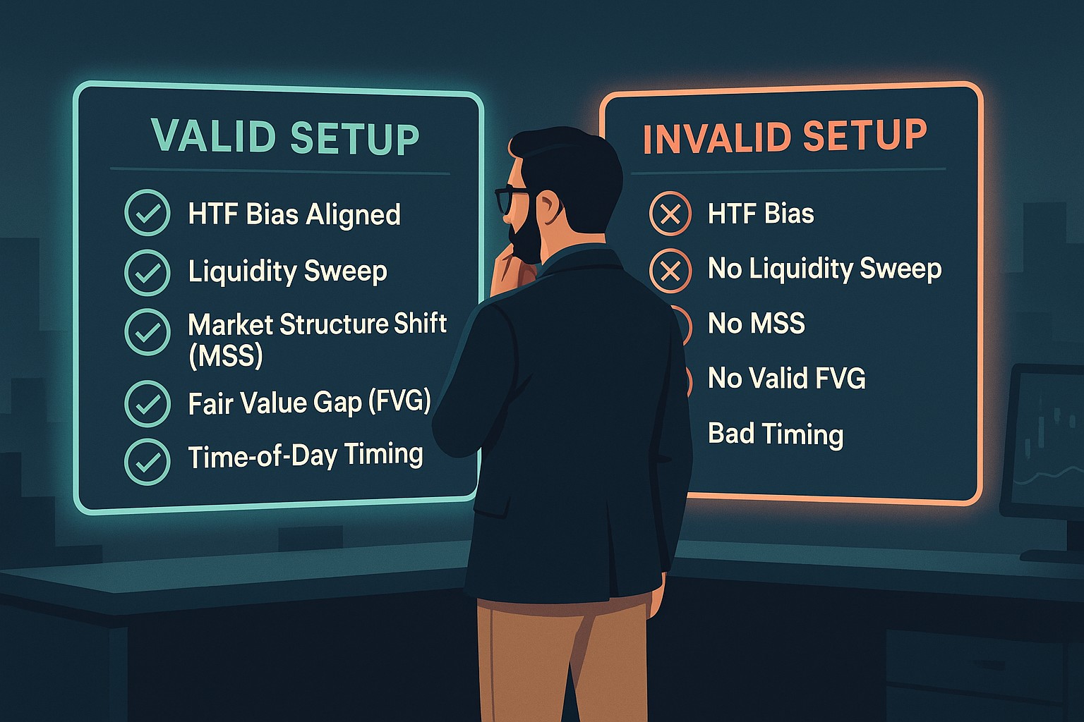 HTF bias aligned? Liquidity sweep taken? MSS/BOS confirmed? Valid POI? FVG present or mitigation? Timing aligned (London/NY)? Market condition favorable? If any critical confirmation is missing - the setup is invalid .
