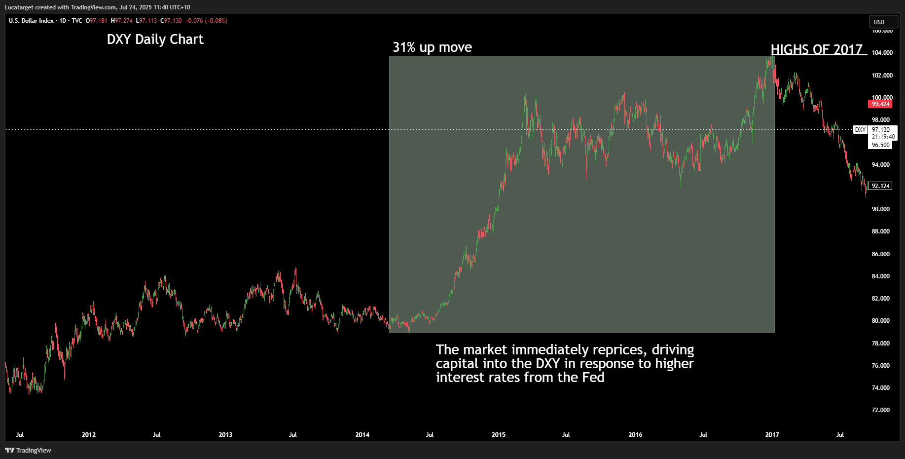 CPI comes in hotter than expected. Markets fear the Fed will respond aggressively. Yields rise, and the USD spikes.