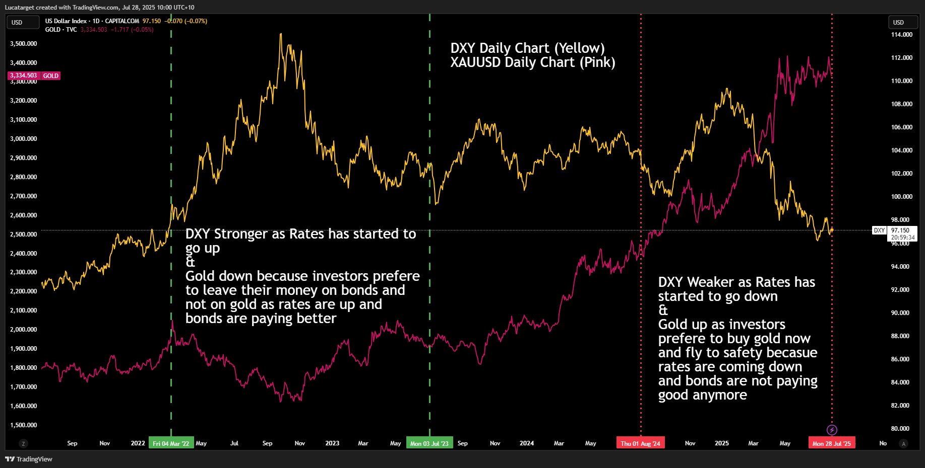 Gold reacts a bit differently. It doesn’t pay any interest, so when rates go up especially real interest rates after inflation it becomes less attractive compared to bonds or savings accounts.