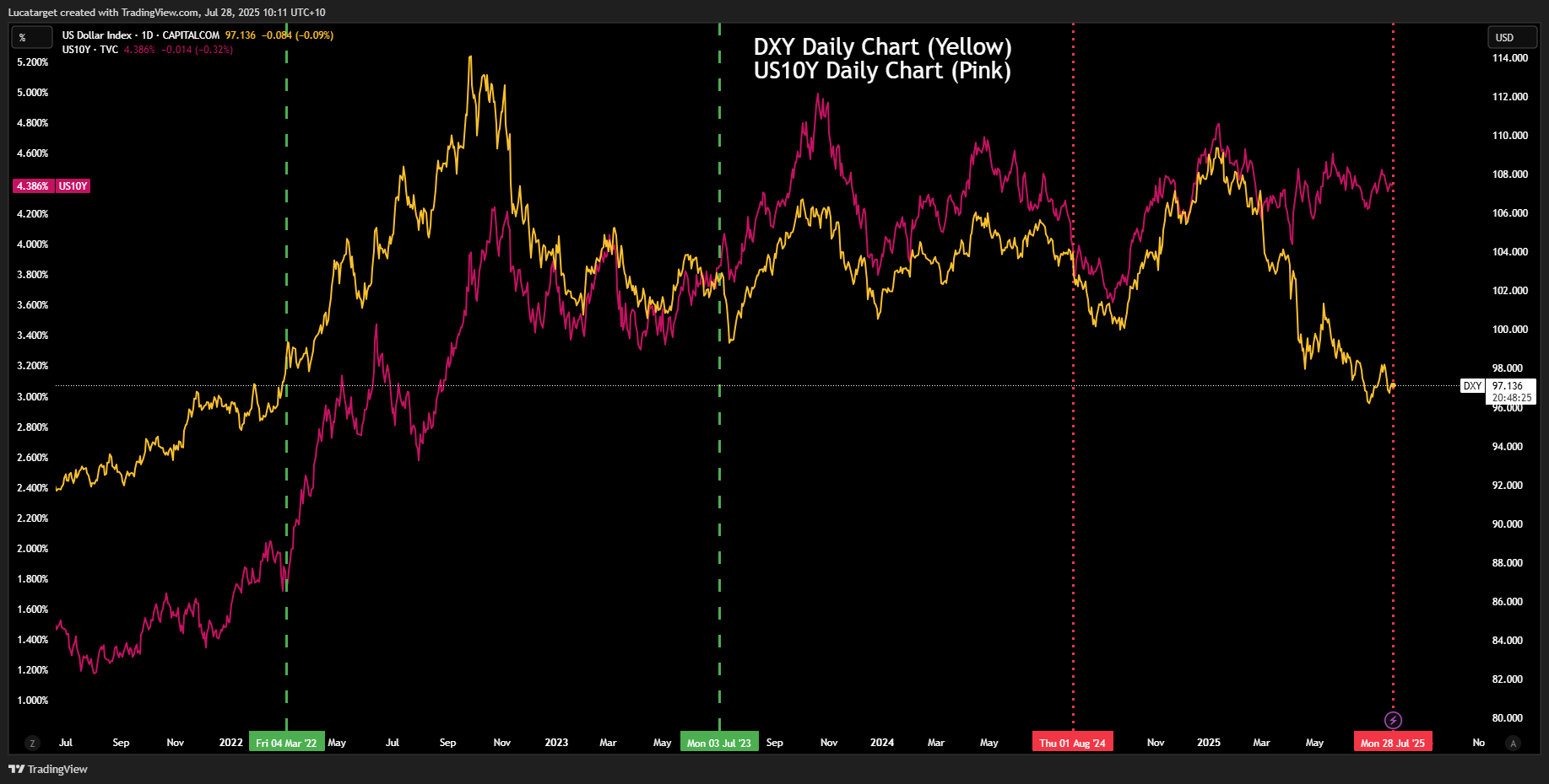 A higher rate will make a currency stronger (Bullish) a lower rate will make a currency weak (Bearish). We can clearly see that on the DXY since the FED raise rates for the first time after COVID on March 16 2022 and started to cut rates on Sep 18 2024.