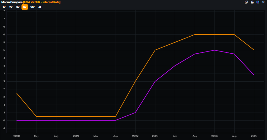 So if the U.S. raises rates while Europe holds steady, the dollar usually strengthens against the euro. Have a look at thsi image USa on purple and Europe on yellow.