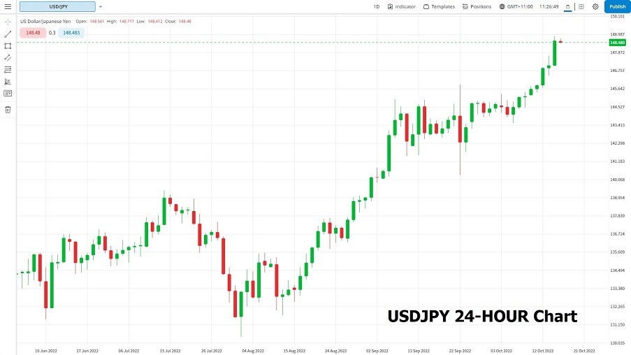 • USD/JPY – The US Dollar soared to a fresh 32-year high at 148.86 overnight before easing to settle at 148.62 at the close of trade in New York. Rising US bond yields continued to drive this currency pair north. In choppy trade the overnight low was at 147.09.