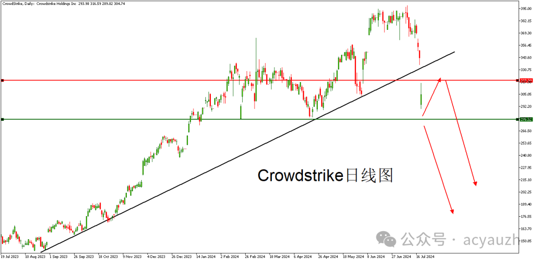 从股价上看,Crowdstrike本轮股价大幅下挫直接破位了一线支撑,而随着后续负面影响逐渐发酵,或将有更大幅度的下跌空间。有可能会破位重要支撑276附近,空头可以选择关注破位追空或者短线拉升反弹后的高位做空。
