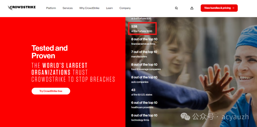 而这次造成全球史上最大IT事故的始作俑者就是CrowdStrike,这是一家成立于2011年的年轻网络安全公司,主要业务一直以基于云软件提供网络安全服务为主。过去十多年里该公司发展迅速,出事前是一家市值近千亿的业内巨头,其官网上宣称位全球1000家企业中的538家提供服务,但也正是基于如此庞大且“高端“的客户群体,这次宕机事件造成的影响才震惊了整个世界。