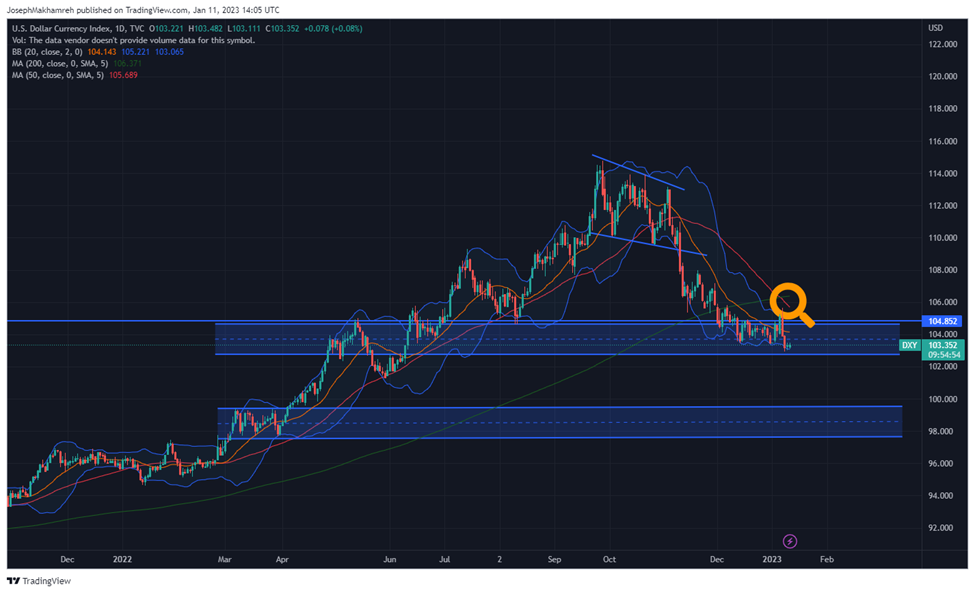 ومن هنا سنقوم بتحليل الرسم البياني اليومي الخاص في US Dollar Index: