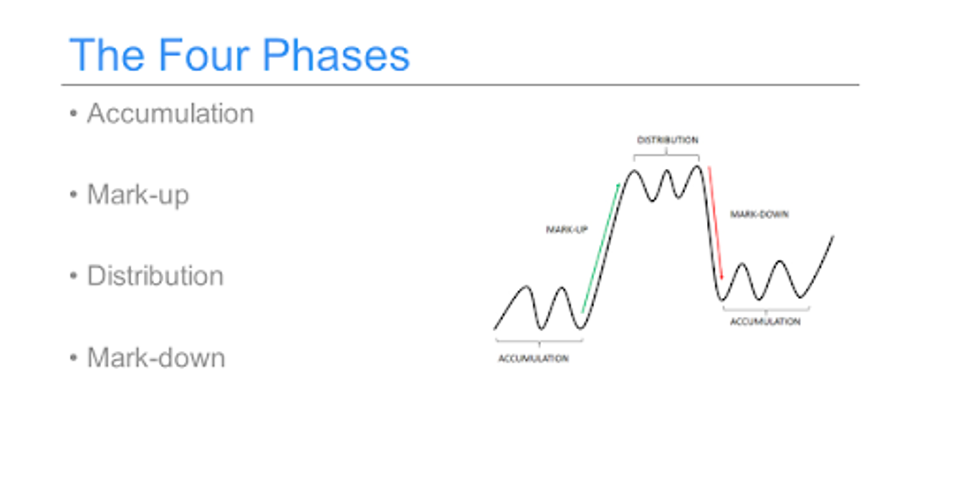 دورة الأسواق تمر بأربع مراحل: التراكم، والزيادة، والتوزيع، والانخفاض. مرحلة التراكم هي عندما يشتري المستثمرون الأسهم بأقل الأسعار. مرحلة الزيادة هي عندما ترتفع أسعار الأسهم. مرحلة التوزيع هي عندما يبيع المستثمرون الأسهم بأسعار مرتفعة. مرحلة الانخفاض التدريجي هي عندما تنخفض أسعار الأسهم.
