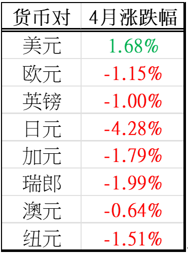 4月的汇率变化基本上是美元一枝独秀,月度涨幅来到1.68%,创下1月以来的最大单月涨幅,同时也写下月线4连阳。