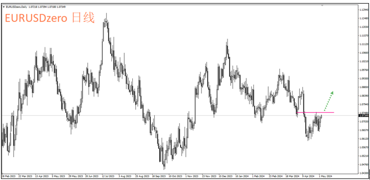 当前欧元区的通胀持续放缓,欧央官员们也释出相对鸽派的观点,市场预期欧洲央行在6月降息的概率来到8成以上,然而恰恰在这样的情况下,欧洲商业银行将放松家庭购屋与信用贷款的条件,将使欧元区的经济数据触底回升,从4月份德国IFO商业景气指数来到89.4,连续3个月改善可见一斑。美国与德国10年国债的利率差距也开始收斂。这部份也反映欧元这两周有逐步形成一个短期底部的现象。若接下来能站稳1.0750之上,欧元短期内或有机会继续上行至1.0800~1.0900。
